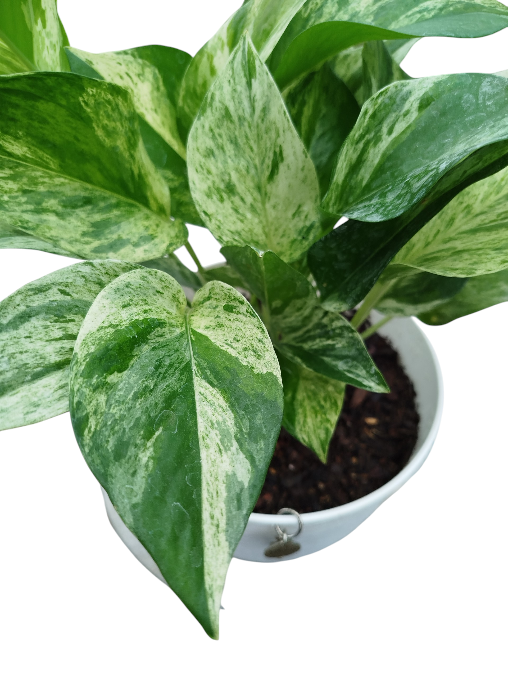 Si el potus tradicional es el rey de la resistencia, el Marble Queen es la reina de la elegancia. Sus hojas en forma de corazón presentan una intrincada mezcla de verde y blanco crema, creando un efecto de “mármol” que aporta una luminosidad inmediata a cualquier ambiente interior 🖼️. Es la planta colgante por excelencia para estanterías o bibliotecas, donde sus guías pueden caer creando una cascada de hojas claras que parecen brillar con luz propia. ¡Una pieza de diseño vivo que no puede faltar en tu colección! 🌟🍃